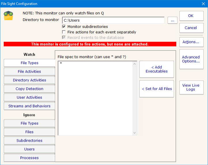 Adding this action to a File Sight monitor without also adding an Email Action will cause a warning.