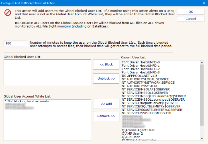 The Blocked Users List is a global list of accounts shared among all File Sight monitors within a PA File Sight installation, including those on Satellite Monitoring Services. Its purpose is to protect the servers from accounts performing malicious activities.