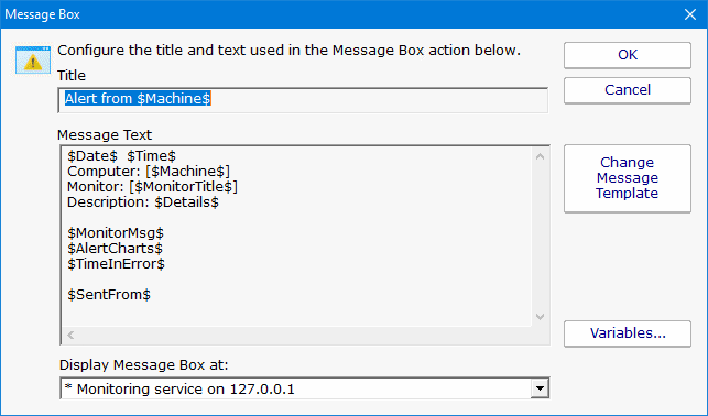 This action can be used when you want a message box to pop-up on the machine that is running the monitoring service with details about a recent anomaly. The Message Box Action keeps track of how many more message boxes are waiting to be shown, and lets you cancel them all at once if you choose to.