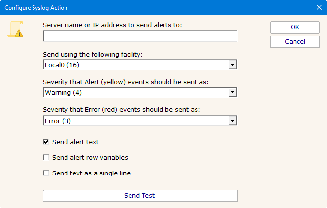 The Syslog action will send a summary description of a monitor's findings as a Syslog event. You can configure the action to send the log event to any server/device on the network that is listening for syslog events.