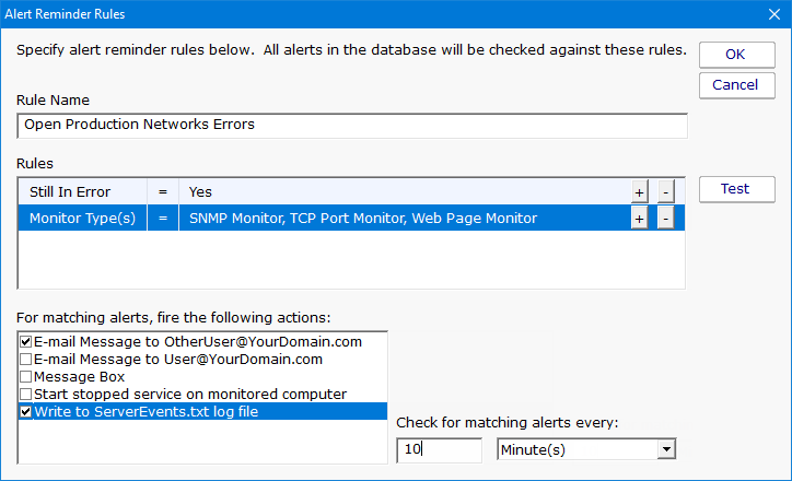 Defining reminder rules is very simple. Just select the fields that describe the set of alerts you want to be reminded on. For example, the field "Still in Error" is something you would probably want to set to Yes. You can alert on acknowledged or not, time when the error first occurred, or the most recent time that it occurred.