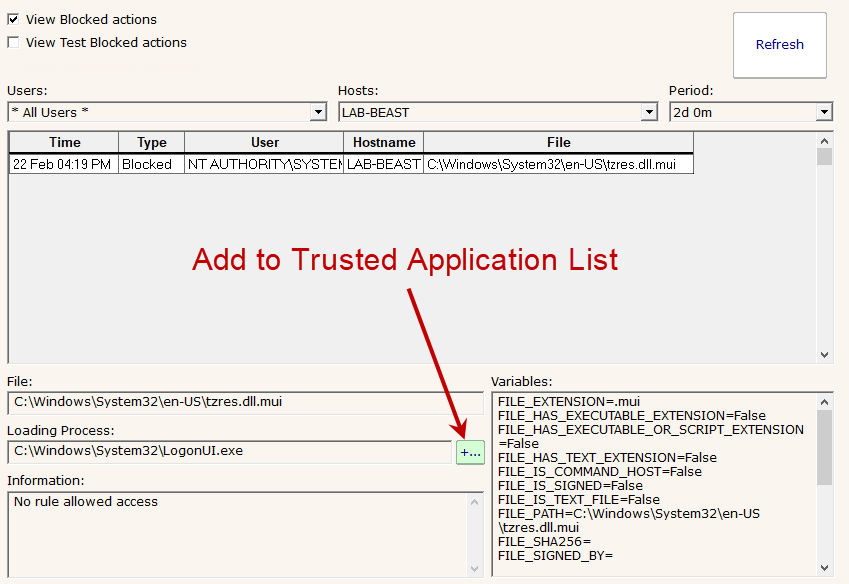 Clicking this button will send a query to the Central Service, Satellites, and Endpoints to get a list of signers, file sizes and file dates for that particular file. If the next attempt to launch matches those criteria, the application will be trusted and allowed to run.