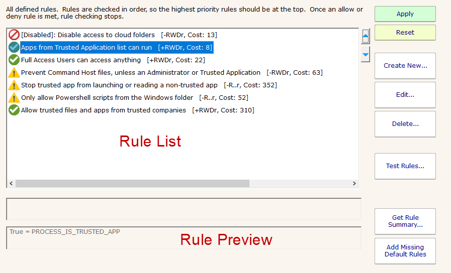 To the right of each rule is whether it allows + or disallows - I/O, and what types of I/O are impacted (Read, Write, Delete, rename/Move). In addition, an approximate relative cost of running the rule is shown.
