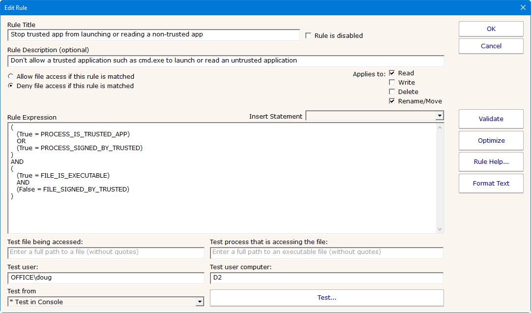 Testing expressions is recommended. At the bottom of the Rule Editor are a set of fields. Fill these in to simulate a file access request that might happen. The expression will run, with the Statements being evaluated for the given test field values.
