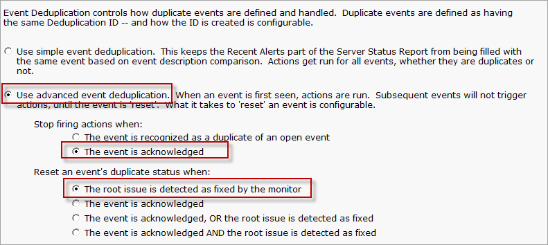A common desire is to be notified when there is a problem, possibly with event escalation, and then to quiet the alerts while the problem is being worked on. This can be enabled using Event Deduplication.