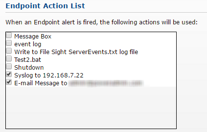The first decision is how you want to be alerted if an Endpoint is not communicating with the PA File Sight installation. A list of notification actions that you've already defined is shown. Simply check or uncheck any entry that is available to you.