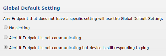 Endpoints don't have specific alert settings initially. So they will use the Global Default Setting that is shown. The third option prevent receiving alerts if an Endpoint isn't communicating because the client computer has been turned off.