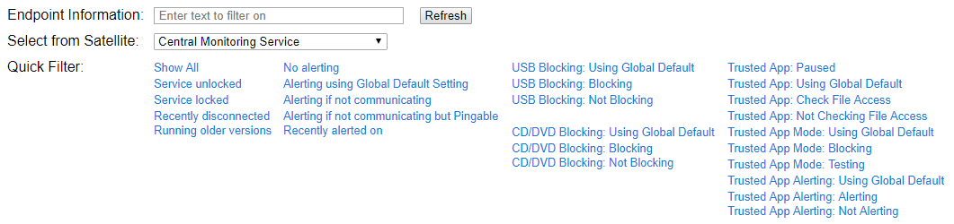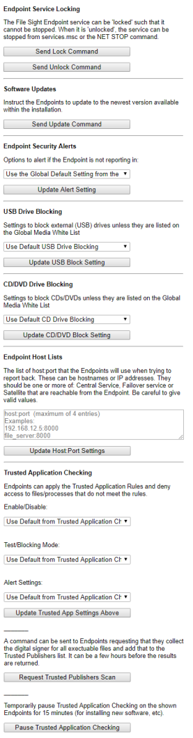 Endpoint Service LockingWhen an Endpoint Service is locked, it cannot be stopped from the Windows Service Control Manager (services.msc) or the net stop command. This prevents end-users from preventing file copy tracking. Software UpdatesThis is a simple way to tell Endpoints to update to the same software version as the Central Monitoring Service or Satellite that the Endpoint is connected to. Note that there is a shortcut filter "Running older versions" to easily select those Endpoints that need to be updated. Endpoint Security AlertsThe Endpoint Alerts page lets you set the Global Default alert setting. This option lets you set a specific alert setting to the filtered list of Endpoints. You can change them to use the Global Default, or to a specific alert setting. Please see the Endpoint Alert settings page for more information. USB Drive BlockingUSB Drive Blocking lets you optionally block external USB drives from computers where the Endpoint is installed and running. The options are to only allow white listed external drives (that are defined on the USB/CD Drive Blocking page) and block everything else, block everything, or to block nothing. CD/DVD Drive BlockingThis option is very similar to the USB Drive Blocking option, except it operates on CDs/DVDs that are inserted into the Endpoint computer. The white listed discs can be specified on the same USB/CD Drive Blocking page as above. Endpoint Host ListsThis option will allow you to change where the Endpoints (listed on the left) will report back to, including upto 3 backup services. You could change them to report to a satellite and then to the central service as a backup, or any combination you need. Once you enter the hostname or IP address with the port number select the Update button to push the changes to the Endpoints. Trusted Application CheckingA variety of Trusted Application settings can be set on the Endpoints. When the Update Trusted App Settings Above button is pressed, the three shown settings ( Enable/Disable, Test/Blocking Mode AND Alert Settings) will all be sent to the selected Endpoints. Request Trusted Publishers ScanClicking this button will request that the selected Endpoints scan all .exe and .dll files on the system and collect the digital signatures from each, and then merge them into the Trusted Publishers list. This can take a while to complete. Pause Trusted Application CheckingClicking this button will send a command to the selected Endpoints to pause all Trusted Application checks for 15 minutes. This is useful when temporary unsigned files need to run, as is often the case when software is installed. Each click of the button will restart the 15 minute pause time. |