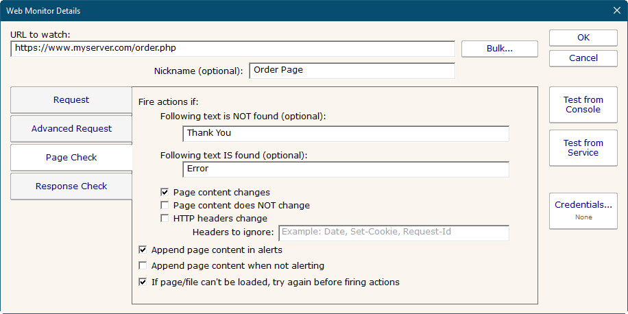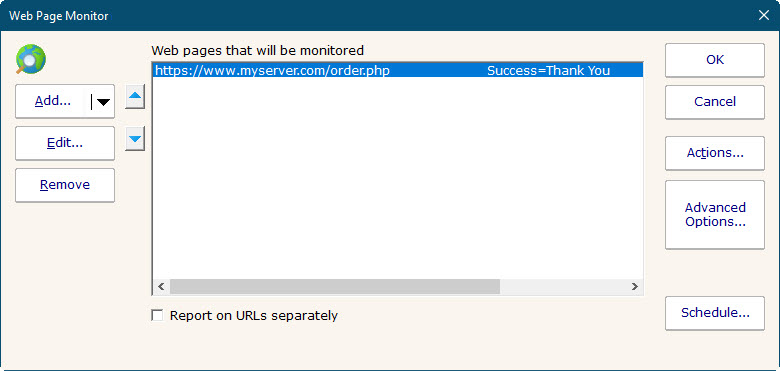 One or more pages can be checked by each monitor. If any pages are not OK, the monitor will fire actions. You can also create multiple Web Page monitors to check