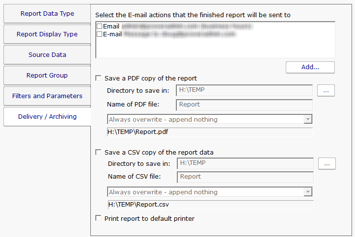 If you choose to create a Scheduled Report ran than running an Ad Hoc Report, there is an additional tab for emailing the report and/or saving the report data.