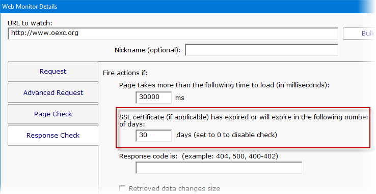 (See the SSL certificate setting about 3/4 of the way down the dialog). In this example, a warning will be sent once the certificate is going to expire within the next 30 days.