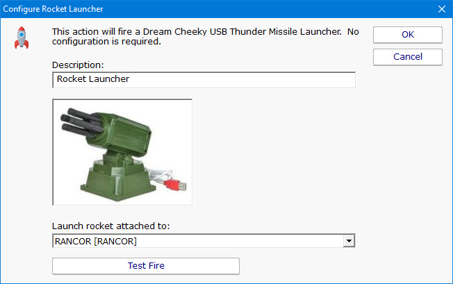 The Dream Cheeky Thunder USB Missile Launcher (purchased separately) can be attached to the server where the PA Server Monitor is installed via the USB cable. The Rocket Launcher action can then be attached to any monitor. No configuration is needed.