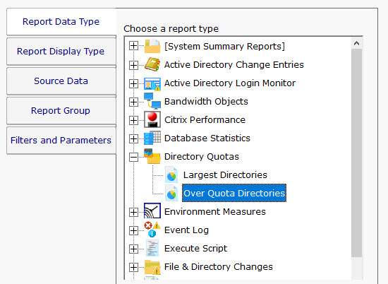 After having selected the report type and the display format, it's time to choose which data to report on. This is done on the Source Data tab. This tab will display all of the data that is available for the chosen report type. In this case we are shown drives that can be reported on. The radio buttons at the top display the available data sets in different ways. In addition, the Filter box will filter the displayed items down to entries that contain text that you enter. This makes finding a particular data set from a very large list quick and easy.