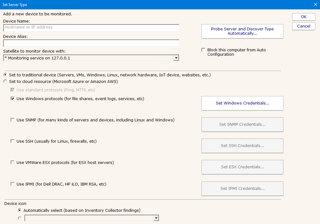 The next step is to tell PA Server Monitor what type of server/device is being added. This helps the product know which protocols to use when communicating with the server/device. The dialog below is how you indicate this. The buttons on the right let you give device-type credentials (ie Windows username/password, SNMP community string, etc). The button also indicates the credentials currently being used.