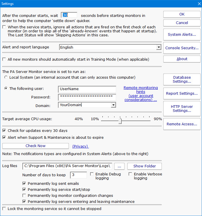 The Settings dialog lets you configure global aspects of the monitoring service.