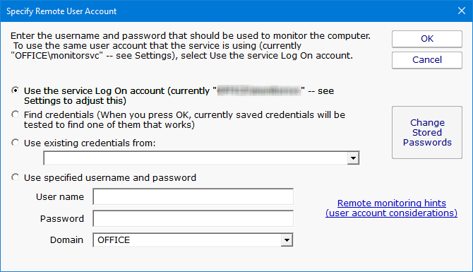 When you press OK, the credentials are checked by trying to access the target server's Event Log and the list of running services. If this succeeds, the credentials are saved.