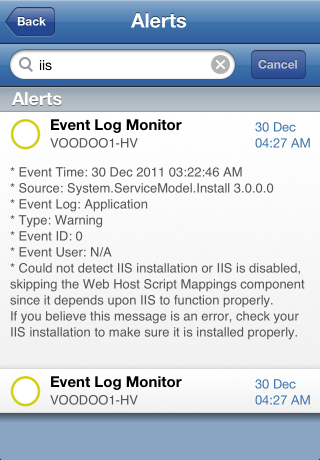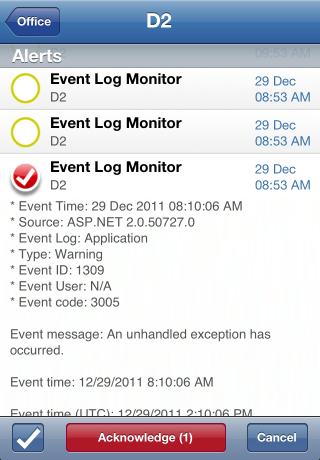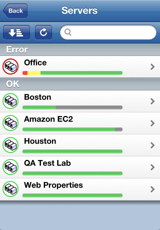 You can also press the Alerts button on the home screen to see a global list of recent alerts. These alerts can be sorted/grouped just like servers. They can also be acknowledged. And, using the search bar, you can filter for entries that contain the specified text.
