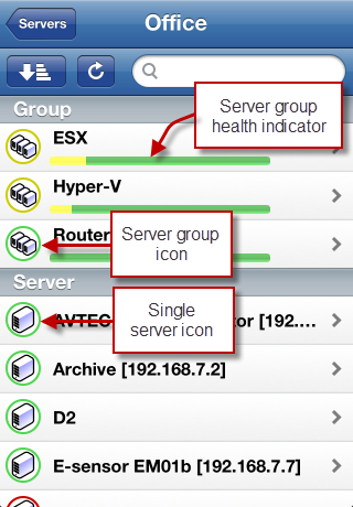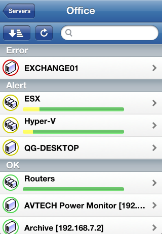 Clicking the sort/group button in the upper left brings groups with problems to your attention by listing them first. In the image above, the Office group has some some error and a few more alert monitors somewhere. Clicking that group will drill down to the Office group.