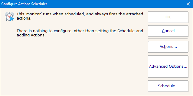 This 'monitor' makes it very easy to schedule IT automation tasks by simply setting the schedule for when the tasks should run, and adding the Actions that you want to run.