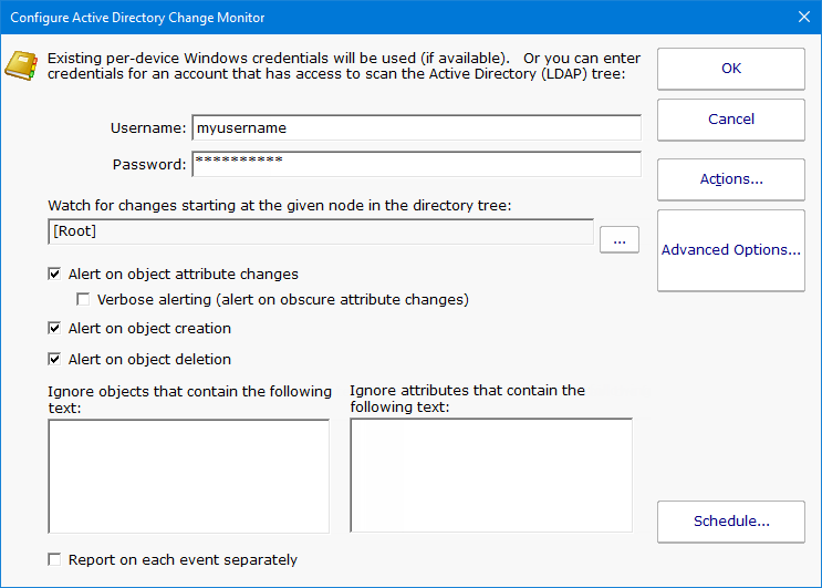 In the above example, the node of the Active Directory tree is selected to be monitored. Alerting is set up to alert on attribute changes and object creation and deletion.