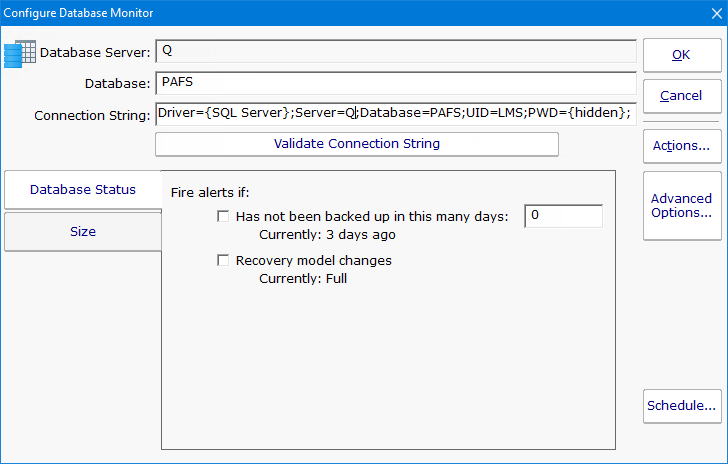 The Database Monitor has two tabs that control what it will watch. It can watch and alert on the status which involves the database's backup and recovery model. To watch that the database itself is up, use the Database Server Monitor above.
