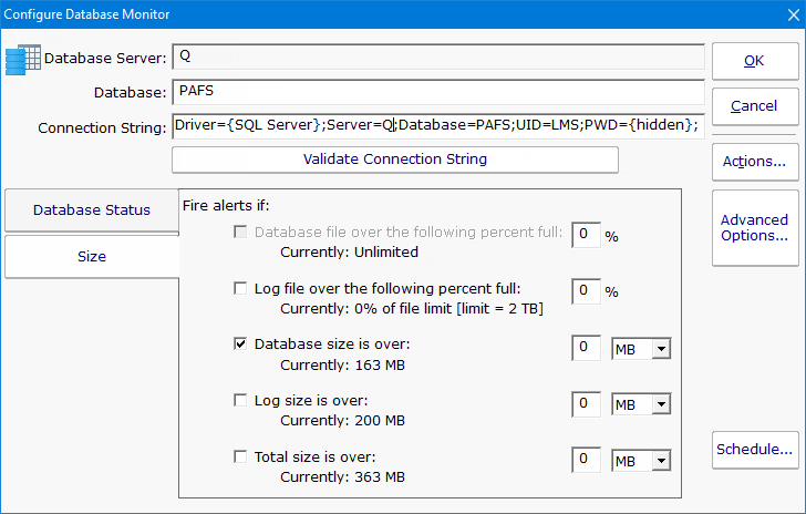 When this monitor is created via the Database Server Monitor, the connection string is automatically generated for you based on the connection string used in the Database Server Monitor. You can edit it as needed.