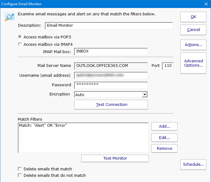 Above you can see the configuration dialog for configuring the Email Monitor. The Mail Server Name is taken from the server that the monitor is attached to. Mail server type (POP3 or IMAP4), username, password, port and encryption settings can be set.
