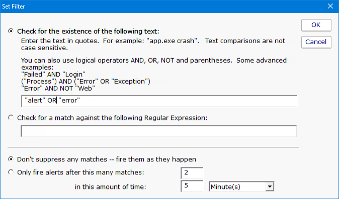 The most powerful part are the filters. Here you can specify what needs to match in order for the actions on monitor to fire. The matching text should be placed in quotes. You can use parentheses, and AND, OR and NOT logical operators. In addition, a regular expression can be used.