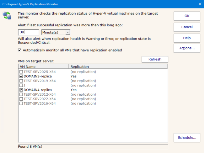 If you uncheck this option, you can select individual VMs from the list. Only checked VMs will be monitored. VMs that do not have replication configured are shown greyed out in the list and cannot be selected.