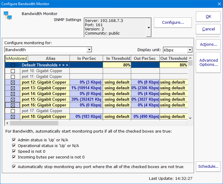 For a large switch, or for counters coming from a computer where network hardware is changed, the available ports be added or removed, or their status might change (from being used to no longer in use, etc). The check boxes at the bottom of the monitor enable automatic monitoring of newly added/active ports, or to stop monitoring removed/disabled ports.