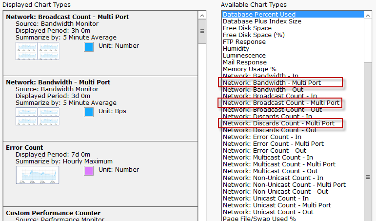 Most monitors can show configurable charts for data that is retrieved. The Bandwidth Monitor can show charts for each kind of data that is retrieved (Bandwidth, Error Count, etc). Because the Bandwidth monitor can track so many ports, and this data is frequently charted, a special Multi-Port chart is available to show the bandwidth data together. Examples are shown below (this image comes from the chart configuration screen).