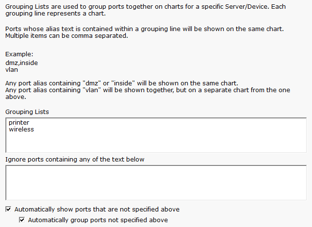 The second half of the dialog lets us control how the ports are grouped together. By default they are grouped together numerically (i.e. the first X ports are together, and then the next X ports, etc). You can group the charts based on their alias. In the example above, any ports that have 'printer' in their alias will get grouped together into a chart, and any that have 'wireless' in their alias will get grouped together in a separate chart.