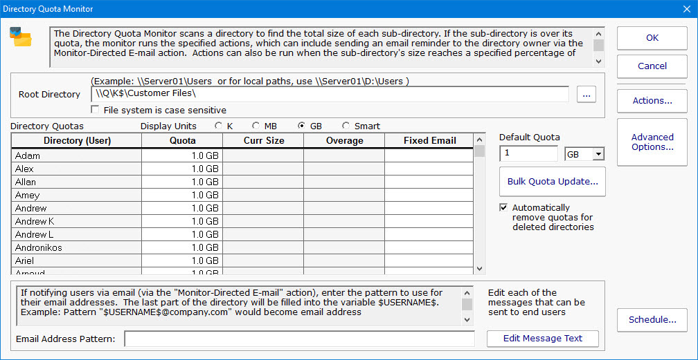If you want end users (directory owners) to receive email quota reminders, be sure to add the Monitor Directed-Email action. The Directory Quota Monitor will need to determine an email address for each user to notify. You can either enter an email address for each directory in the Fixed Email column or create an Email Address Pattern for combining the directory name with some text to come up with an SMTP email address (this scenario assumes the directory name is closely related to a username). You can also edit the message that is sent to the user which can include simple replacement variables indicating quota sizes, directories, etc.