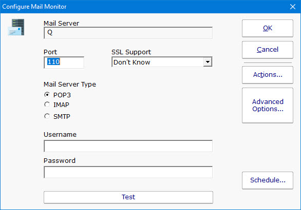 The Mail Server monitor can watch a POP3, IMAP4 or SMTP mail server on a monitored computer to ensure it is up and running. This is accomplished by logging into the server using one of the above protocols using credentials that you supply.