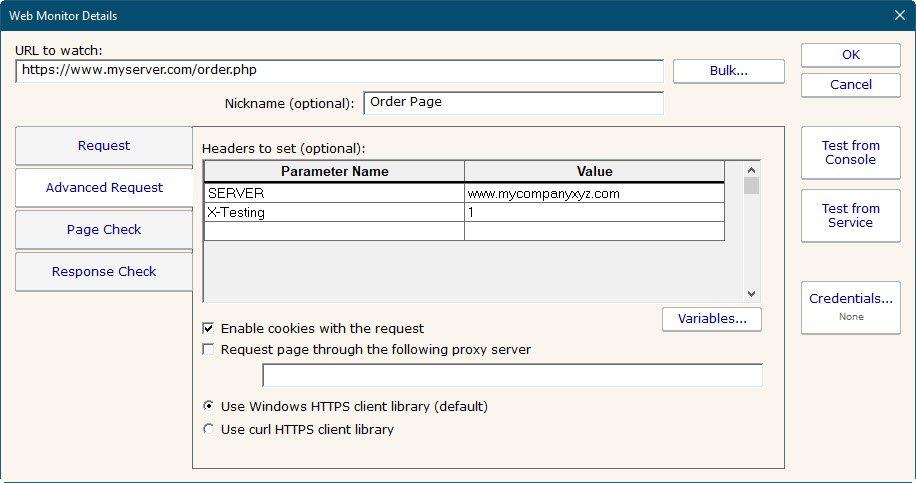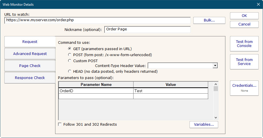 There are two test buttons. "Test from Console" will make the web page request from the Console that you are using. "Test from Service" will send the URL and parameters to the Central Monitoring Service