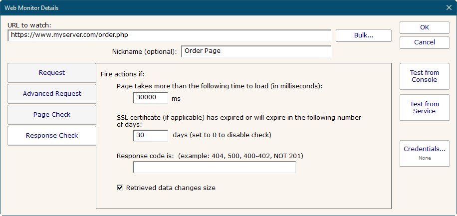 The Web Page Monitor lets you define one or more web pages or web resources that should be checked. You can check return codes, data size,