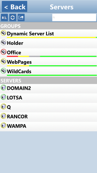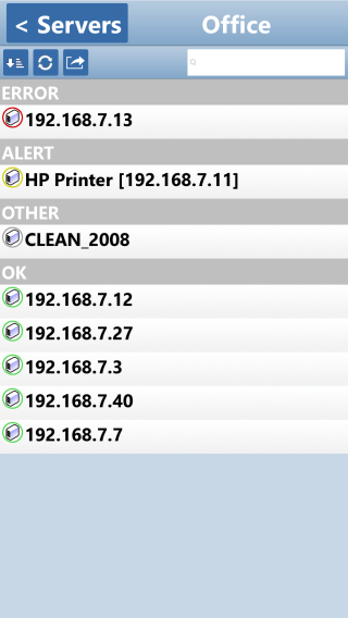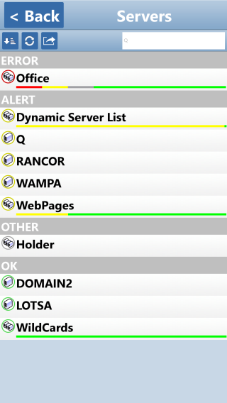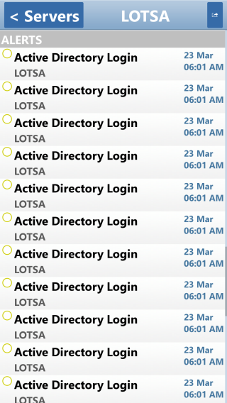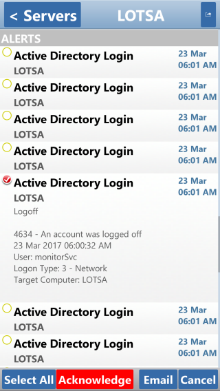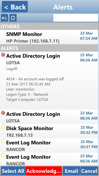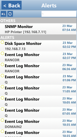 You can also press the Alerts button on the home screen to see a global list of recent alerts. These alerts can be sorted/grouped just like servers. They can also be acknowledged. And, using the search bar, you can filter for entries that contain the specified text.