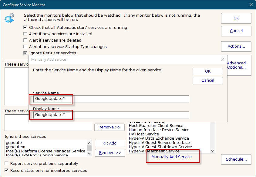 The solution is to add a custom service named GoogleUpdate* and ignore it. This way you ignore all service names that begin with GoogleUpdate. If you want to be less precise, you could ignore Google*