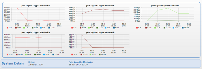 Also note that if a device has fewer than a specified number of ports (3 in this example), the Multi-Port chart won't be used. This allows you to specify a Multi-Port chart at a high level (at Servers/Devices) and if the chart is not appropriate (perhaps for computers where only a single NIC is being monitored) it won't be shown. In addition, if a port is shown in the Multi-Port chart, it won't also be shown in a separate single-port chart (like Network: Bandwidth In).