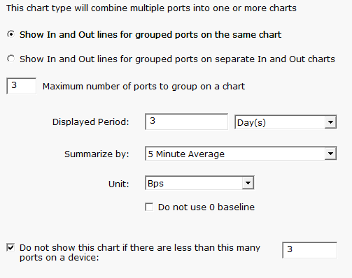 The first half of the dialog controls grouping. Each port has an input and an output value. Some customers want to see all inputs on one chart, and all outputs on a separate chart. Both options are possible. In addition, because showing a large number of ports on each chart would make it hard to read, you can indicate only a certain number should be shown. Additional charts will be created as needed to handle all of the ports.