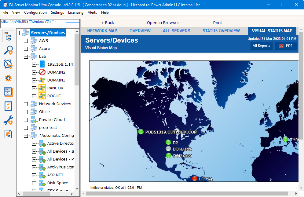 The Visual Status Map is one of the available group level reports. The map display allows you to easily see the status of servers and server groups that you have placed on a map or other graphic. This type of display can beneficial in determining network problems that are geographically significant due to server locations.