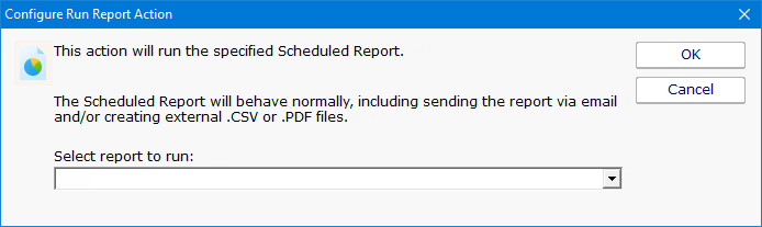 As is shown in the screenshot above, you just select an existing Scheduled Report. When this action is triggered, the Scheduled Report will run, including sending any specified emails and saving external PDF or CSV files.