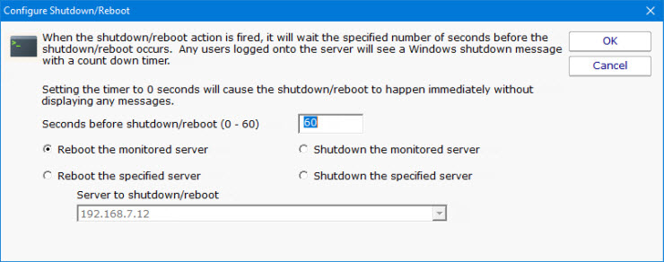 The Reboot Computer action causes a computer to reboot or shutdown when it is run. You can specify which computer using the radio button options. By default the monitored computer will be rebooted when this action is run.