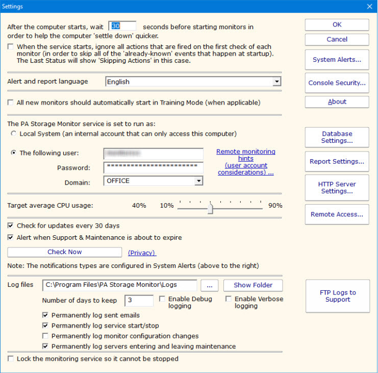 The Settings dialog lets you configure global aspects of the monitoring service.