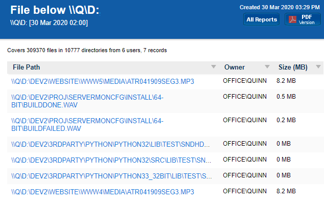 The File System Analyzer monitor of PA Storage Monitor will catalog a file system so you can easily find out what is stored at a high level. Sometimes you want to know about specific files or file types though, such as MP3, MP4, WMV, MOV, AVI, AAC, etc. that might not be allowed on a file server.