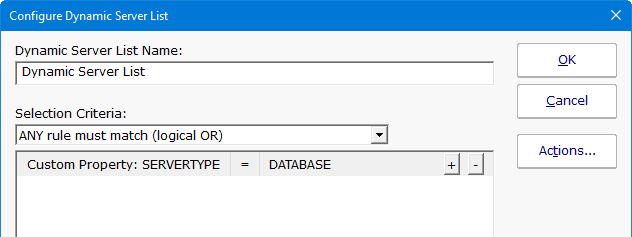 For example, you might add a custom property of "SERVERTYPE" and set it equal to "DATABASE". Then you could create a Dynamic Server List that finds all servers where USAGE=DATABASE as shown below: