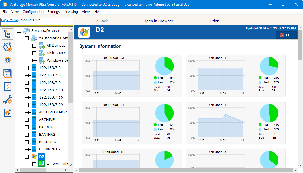 The Console is the administrative interface to PA Storage Monitor. Some buttons that appear in the column at the left are only available if you run the Console on the same machine where the Central Monitoring Service is installed.