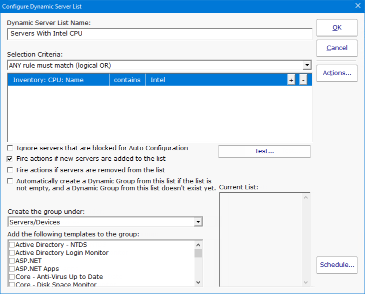 The Dynamic Group is defined by choosing an existing Dynamic Server List. Any server/device that shows up in the Dynamic Server List will belong to the group.