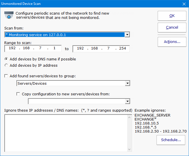 When new devices are found on the network, you can have them automatically added to PA Storage Monitor to a specific group. You can also have a configuration copied from an existing server/device.