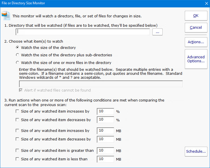 The File/Directory Size Monitor is designed to watch an individual file, a set of files, or an individual directory and execute actions (such as notifying you) if it grows too large.